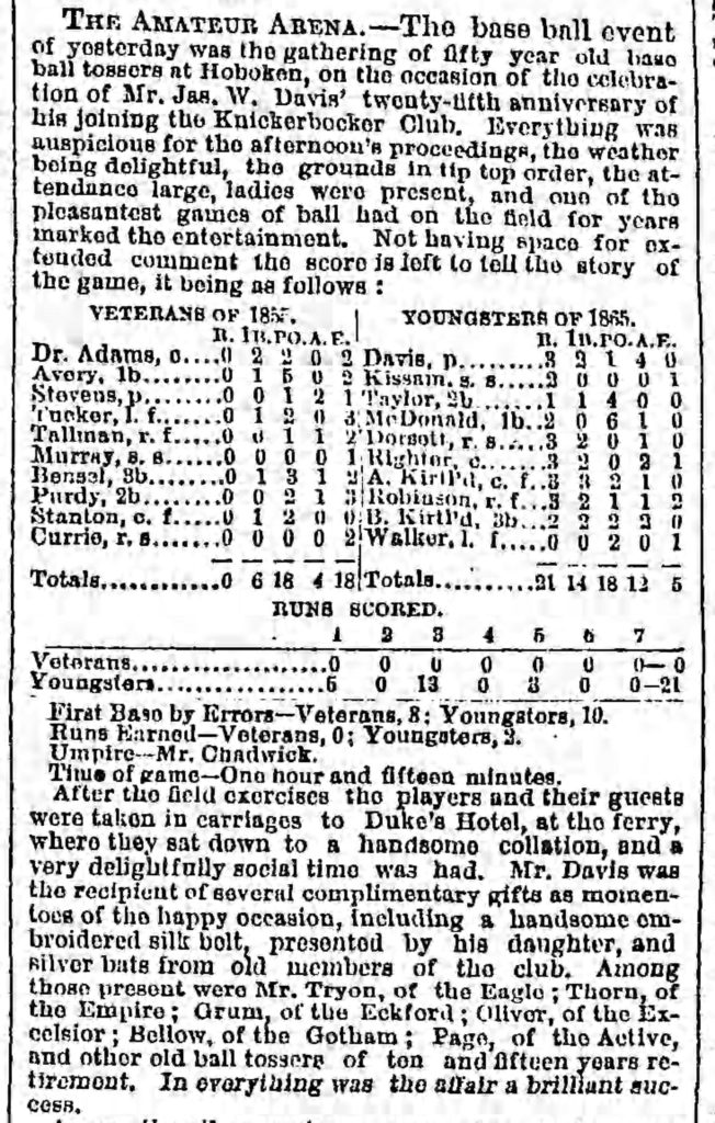 On September 27, 1875, the Knickerbocker Base Ball Club held a reunion base ball game between the 1855 and 1865 teams.