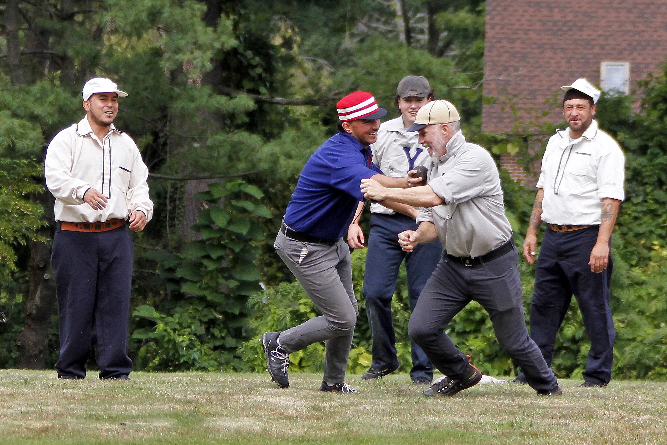 Scheduling conflicts and resulting player availability required Jeff ‘Pinetar’ Kornhaas, the man behind The Knickerbocker Experience, to channel his inner Doc Adams and “employ all his rhetoric to induce attendance”. Although unable to field two full nines, base ball was played. The game had an air of an intramural Knickerbocker practice session as described by Doc Adams. Spirited play highlighted the day which was thoroughly enjoyed by the ballists and appreciated by the cranks.