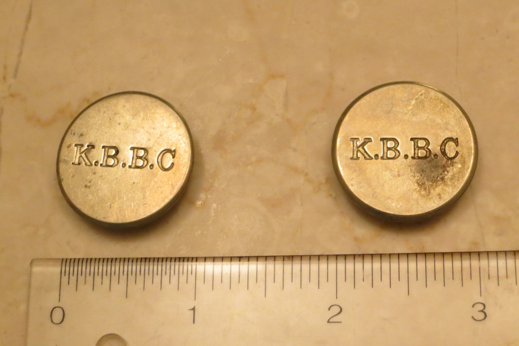 These are also locked up in a bank vault. We have two buttons that belonged to Doc that are embossed with KBBC on them that they’re a little bit larger than a quarter and they’re studs. They are not regular sew-on buttons. And I showed very detailed pictures of them to Jim Gates at the Hall of Fame at the Library. He’s one of the head researchers there. Awfully nice man. He and I talked about the buttons. He said they were probably ceremonial, for special occasions, and he said they’re similar to the sort of stud buttons that would go into a collar of a band uniform or a military uniform.