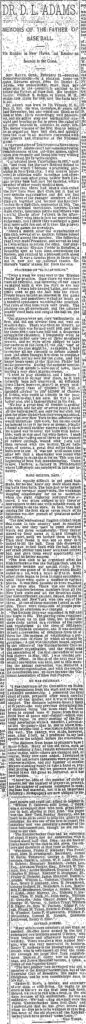 On February 29, 1896, the Sporting News published an article on Dr. D. L. Adams sub-titled ‘Memoirs of the Father of Base Ball’. The article is based on an interview of Doc and details his contributions to the nascent National Pastime. The article seems to derive from one found in the Chicago Chronicle (23 June 1895). Below is the Sporting News article. The rediscovery of Adams’s handwritten “Laws of Base Ball” provided tangible primary, evidence in support of this article.