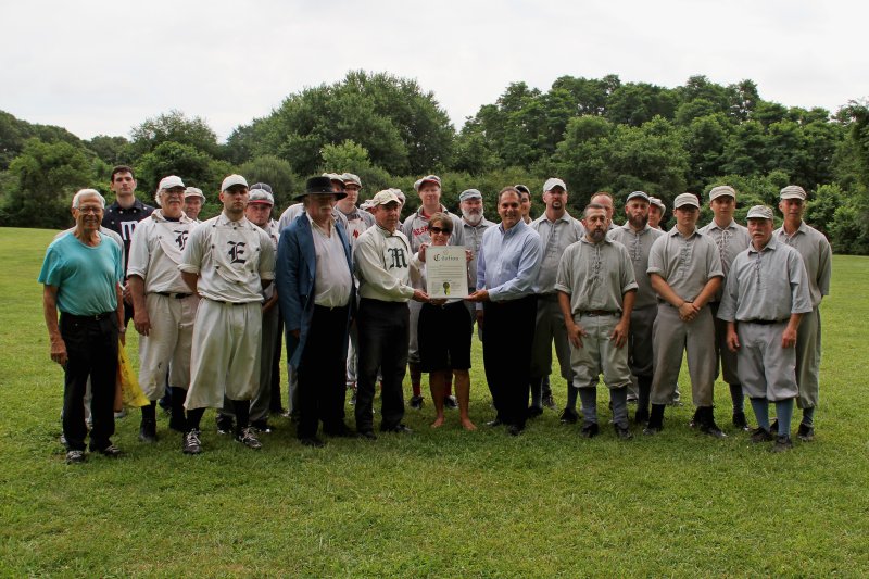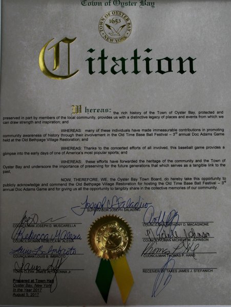 This year’s 20th installment was another special occasion. Joseph S. Saladino, supervisor of the Town of Oyster Bay, presented a Citation recognizing the Doc Adams Old Time Base Ball Festival.