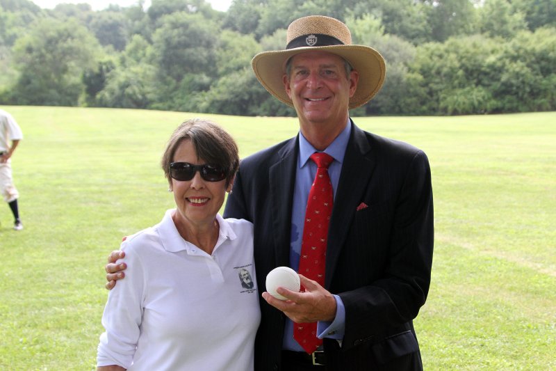Marjorie Adams and John LeBoutillier, former US Congressman, 6th District, NY (as he throws out the ceremonial 1st pitch of the Festival.