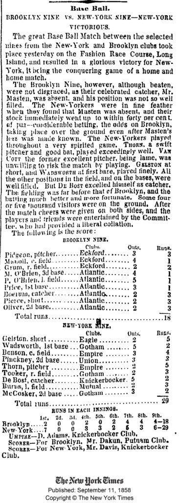 The following is the box score from the 3rd and final game, played on September 10, 1858. The umpire for this important game was none other than Doc Adams of the Knickerbocker Club.