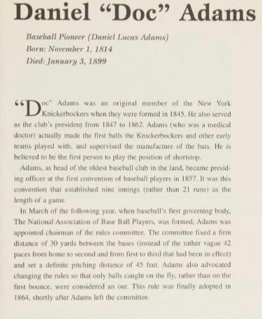 In his book “From Cartwright To Shoeless Joe”, Ron McCulloch discuses Doc Adams role as a baseball pioneer and executive by highlighting his leadership roles with the Knickerbockers and the National Association of Base Ball Players.