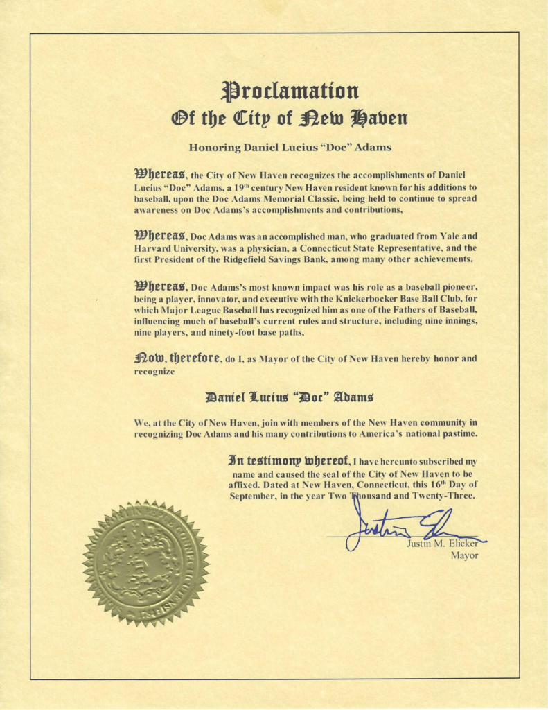 Mayor Justin M. Elicker and the City of New Haven, CT recognized and honored Doc Adams on September 16, 2023 on the occasion of the Doc Adams Memorial Classic.