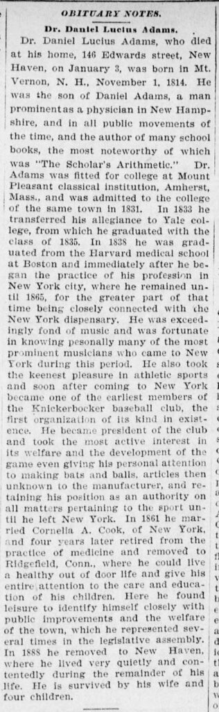 Doc Adams’ Obituaries New Haven Morning Journal and Courier, January 5, 1899 Harvard Graduates Magazine New Haven Morning Journal and Courier (February 6, 1899) New York Tribune (January 6, 1899) Sporting Life (January 21, 1899) Yale Graduate Magazine Share this: Share on Facebook (Opens in new window) Facebook Share on X (Opens in new window) X Share on Bluesky (Opens in new window) Bluesky Share on Pinterest (Opens in new window) Pinterest Share on Reddit (Opens in new window) Reddit Email a link to a friend (Opens in new window) Email Like this:Like Loading...