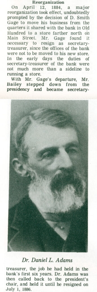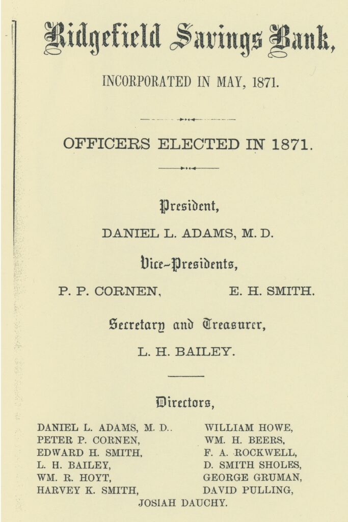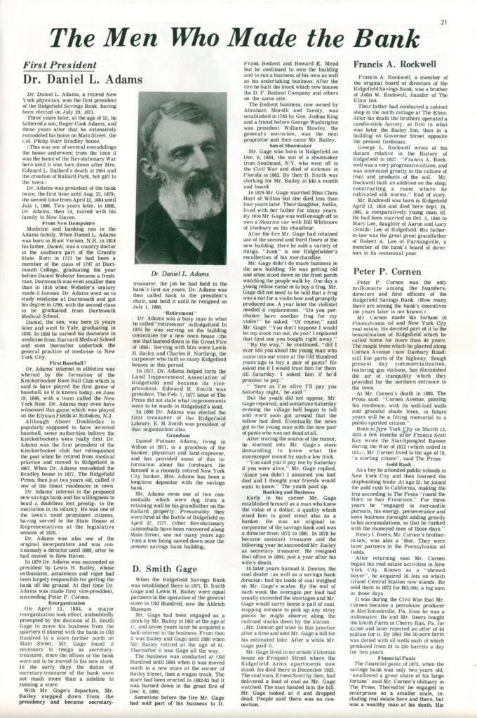 In 2004, the Ridgefield Savings Bank and Fairfield County Savings Bank, merged as the Fairfield County Savings Bank. Downstairs at the Main branch of the Ridgefield Savings Bank, hang the portraits of its former bank presidents led off by the well-known portrait of the banks’ 1st President, our Doc Adams.