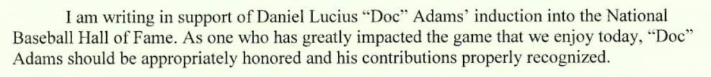 Through delays due to reconstitution of the Era Committees and COVID-19, Doc Adams was eligible once gain for the 2022 ballot but was shockingly overlooked (again). However, we’d like to once again share Senator Blumenthal’s endorsement of Doc. Below are a couple of excerpts from that endorsement. His full endorsement letter, addressed to Jack O’Connell, Secretary and Treasurer of the Baseball Writers of America Association can be read here in its entirety.