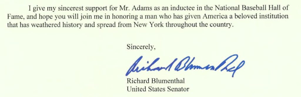 Senator Richard Blumenthal expressed support for Doc Adams in the early days of our quest. When hoping to see Doc Adams on the 2013 Pre-Integration Era Committee ballot for consideration with a goal of Doc being recognized with induction into the National Baseball Hall of Fame for his contributions to the nascent National Pastime.