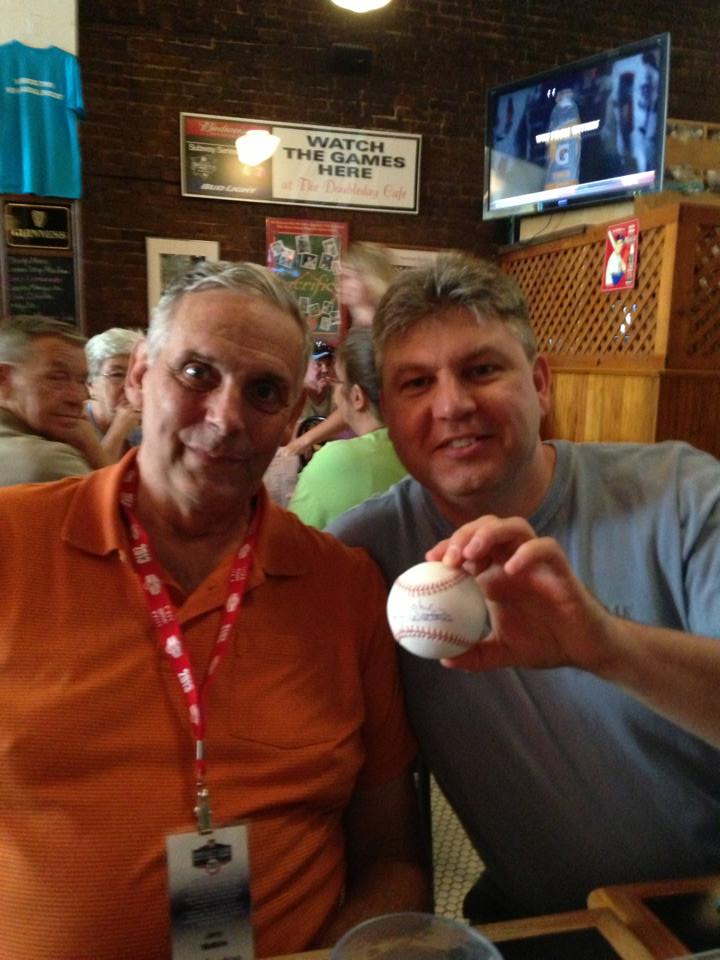 Our first night in Cooperstown we decided to go to dinner with a friend at Mel’s at 22. I had a craving for their shrimp scampi that I enjoyed in June when I attended the Jerry Malloy Negro League Conference. We sat at the bar so we could get service quicker. While we snacked on Hot Nashville Fried Cauliflower, we started up a conversation with the couple to the left of us, Mark and Mary Jo Hallberg. We discussed the weekend, Joe Mauer, and their Minnesota Twins fandom. They both expressed a love for baseball and for good reason. Mary Jo is the daughter of Johnny Klippstein and the grandniece of Emil “Dutch” Leonard, both major league pitchers. Klippstein, who pitched in the majors from 1950 to 1967, has a special place in my baseball journey. As a kid I received a bunch of old baseball cards from a favorite uncle and in the box of cards was a beat up 1957 Topps card of the twirler with his hands over his head wearing a Cincinnati Redlegs uniform. It was my favorite card since it was the oldest card in the box. I was able to share my story of my Klippstein card with the Hallbergs. I could tell Mary Jo was proud of her baseball connections. She went on to say that her dad was a wonderful father and man. She beamed with pride. He passed away in 2003, a week before the World Series.