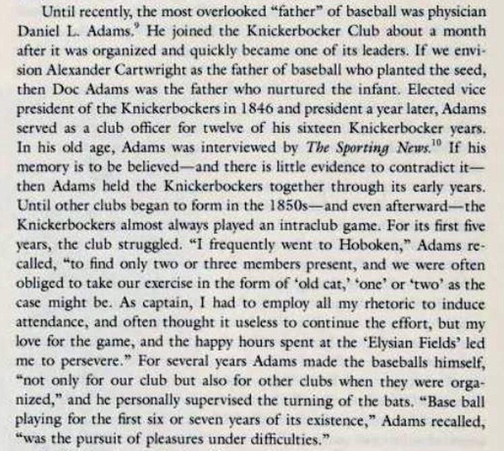 Lawrence Baldassaro’s 2002 book, The American Game, included a chapter by Frederick Ivor-Campbell titled “The Many Fathers of Baseball: Anglo-Americans and the Early Game”. In it, Ivor-Campbell wrote about the previously most overlooked “father” of baseball, Doc Adams.