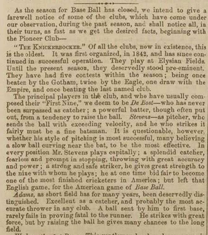 The December 6, 1856 issue of Porter’s Spirit of the Times provided a season wrap-up of sorts including a description of the pioneer Knickerbocker Base Ball Club and its ballists. Of course, this includes a shorts capsule of the good doctor.