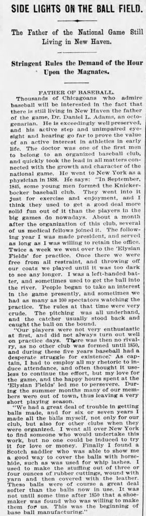 This article was in a column called “Side Lights On The Ball Field” in the Chicago Chronicle. The piece teases the article with “The Father of the National Game Still Living In New Haven” and starts out with “Father of Baseball”.