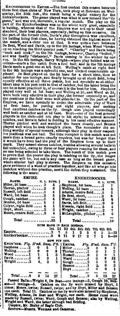 On August 10, 1859, the Knickerbockers played the Empires at Elysian Fields.It was the first game of the 1859 season between these two teams, however, it was not a regular match as they played “the fly game”. In the fly game, the ball must be caught “on the fly” to be an out rather on one bounce. The Knickerbockers won the contest 59-33. Doc Adams played “centre field”. He had 5 “Hands Lost” (a player was charged with a Hand Lost every time he made an out at bat or on the basepaths) but scored 5 runs. On an interesting note, he is also listed as having ‘missed’ one “catch on the fly”.