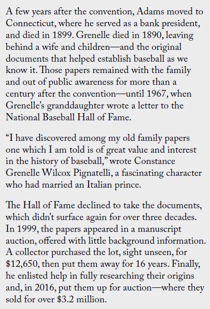 The documents, which make a strong case for New York Knickerbocker player and president Daniel “Doc” Adams being the game’s true patriarch, initially went to auction in 1999. The papers apparently had been in the family of Adams’ fellow Knickerbocker and baseball pioneer William Grenelle. A collector purchased them for $12,000, sight unseen, without truly understanding their import. The “Laws of Base Ball” sold again this spring for more than $3 million. This new anonymous buyer, says Oregon Historical Society Executive Director Kerry Tymchuk, is a “friend of the historical society.”